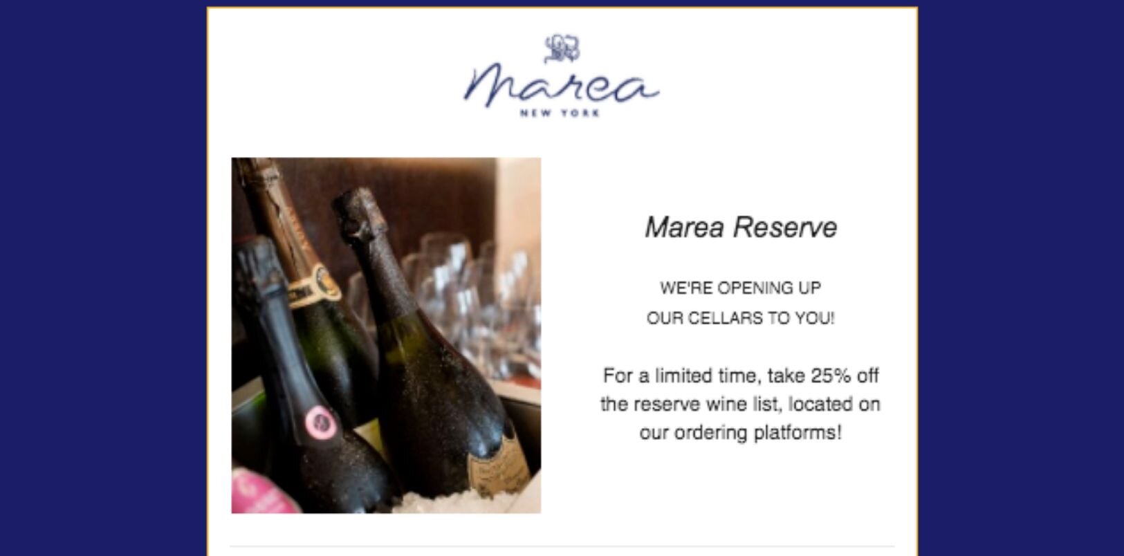 Take Altamarea Group’s Marea, a Michelin-starred restaurant in the heart of NYC, for example. By utilizing robust guest data to accelerate their email marketing efforts, they are able to craft targeted discount offers for their customers that are used time and time again to drive more revenue to their bottom line. Offering 25% off their reserve wine list, and upwards of 50% off their regular wine list, they’re creating a new way to engage with guests outside the dining room through special promotions. Best of all, the numbers don’t lie, with Marea averaging 24+ orders per day at an average order value of $138. That accounts for several thousands of dollars a day in earned revenue, even with their dining rooms closed.