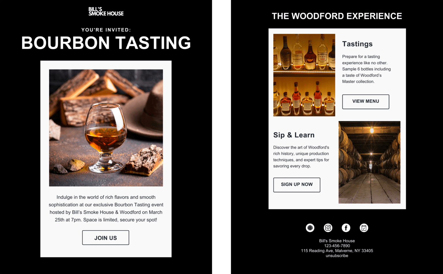Use this template to announce wine and spirit tastings, holiday parties, cooking classes, guest chefs, wine and paint parties, exclusive dinners and more. Update restaurant branding elements, like your brand’s color palette, logo and visuals to make this template your own.