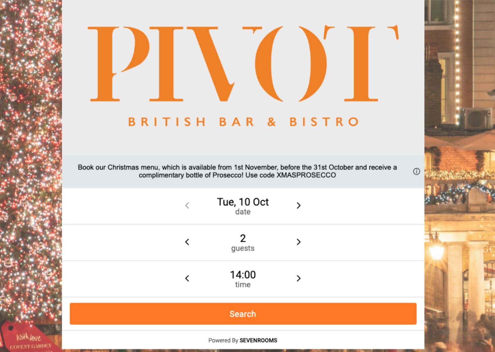 For example, Pivot introduces a seasonal Christmas menu that runs from November through December. Guests who book a table early on receive a complimentary bottle of Prosecco.