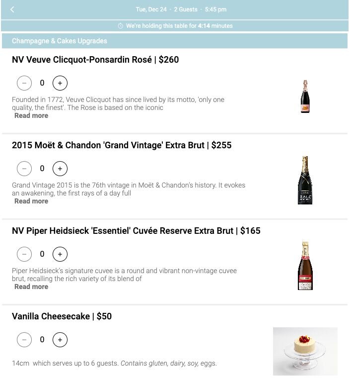 For example, Christmas at Epicurean Sydney encourages guests to pair their dinner menu with crisp champagne and/or top off the evening with an elegant cake for dessert using the SevenRooms booking widget.