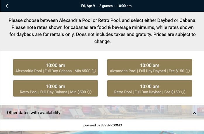 SevenRooms client The Sahara Casino and Hotel in Vegas manages their outdoor pools and rooftops by requiring reservations. During the reservation process, they provide important information to guests such as the food and beverage minimum for their full-day cabanas. This makes it easy for the hotel to collect revenue ahead of a guest’s visit, plus it communicates any and all expectations to guests clearly so there are no surprises upon arrival.