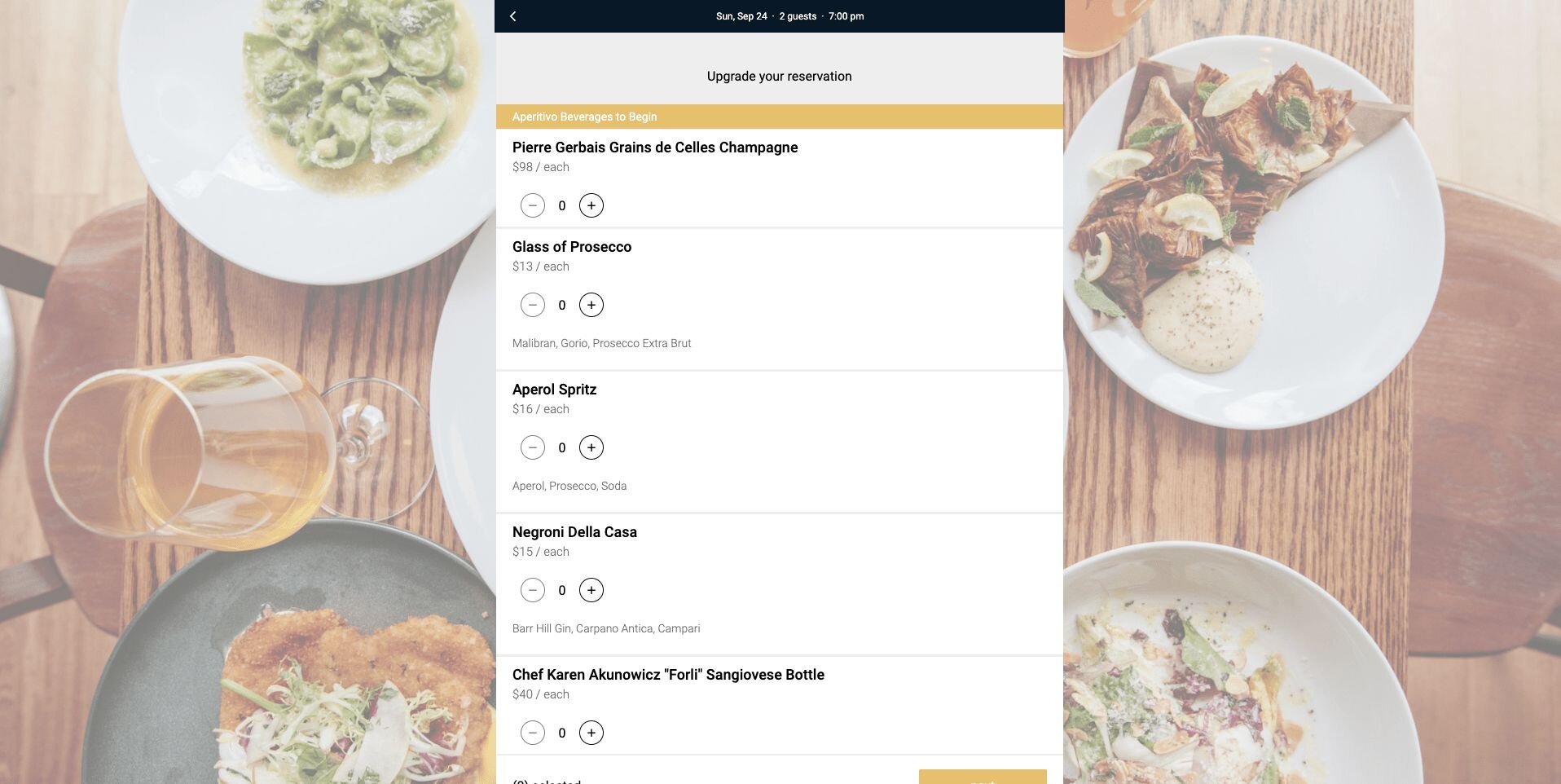 Chef Karen Akunowicz’ Italian enoteca has become one of the most popular spots on the Boston dining scene. Luckily, guests who are able to snag a reservation at this hard-to-book restaurant can toast their success with Champagne, spritzes and more, all available as prepaid upgrades available directly through the booking widget.