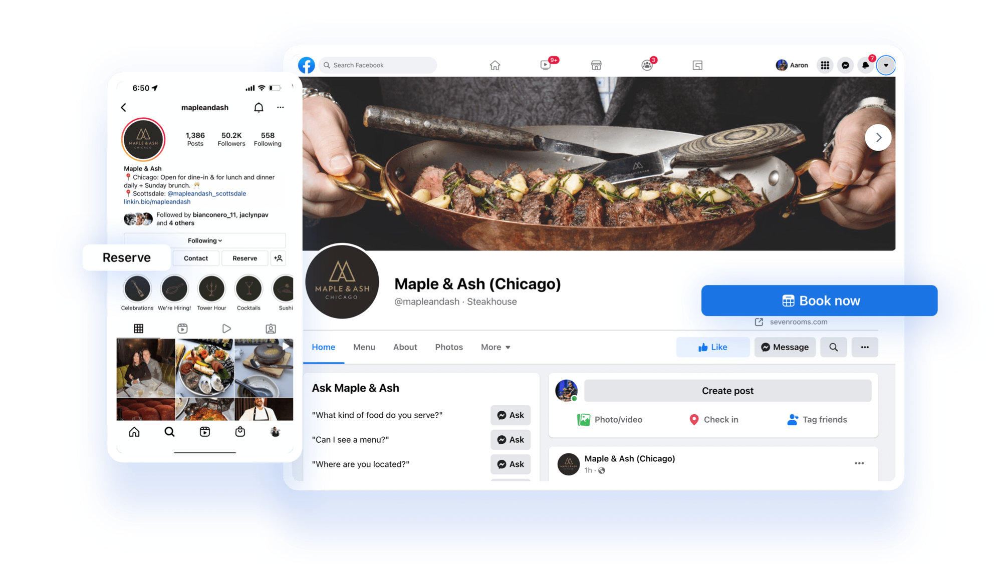 “Book Now” buttons feature prominently on this Chicago steakhouse’s Instagram and Facebook profiles.
