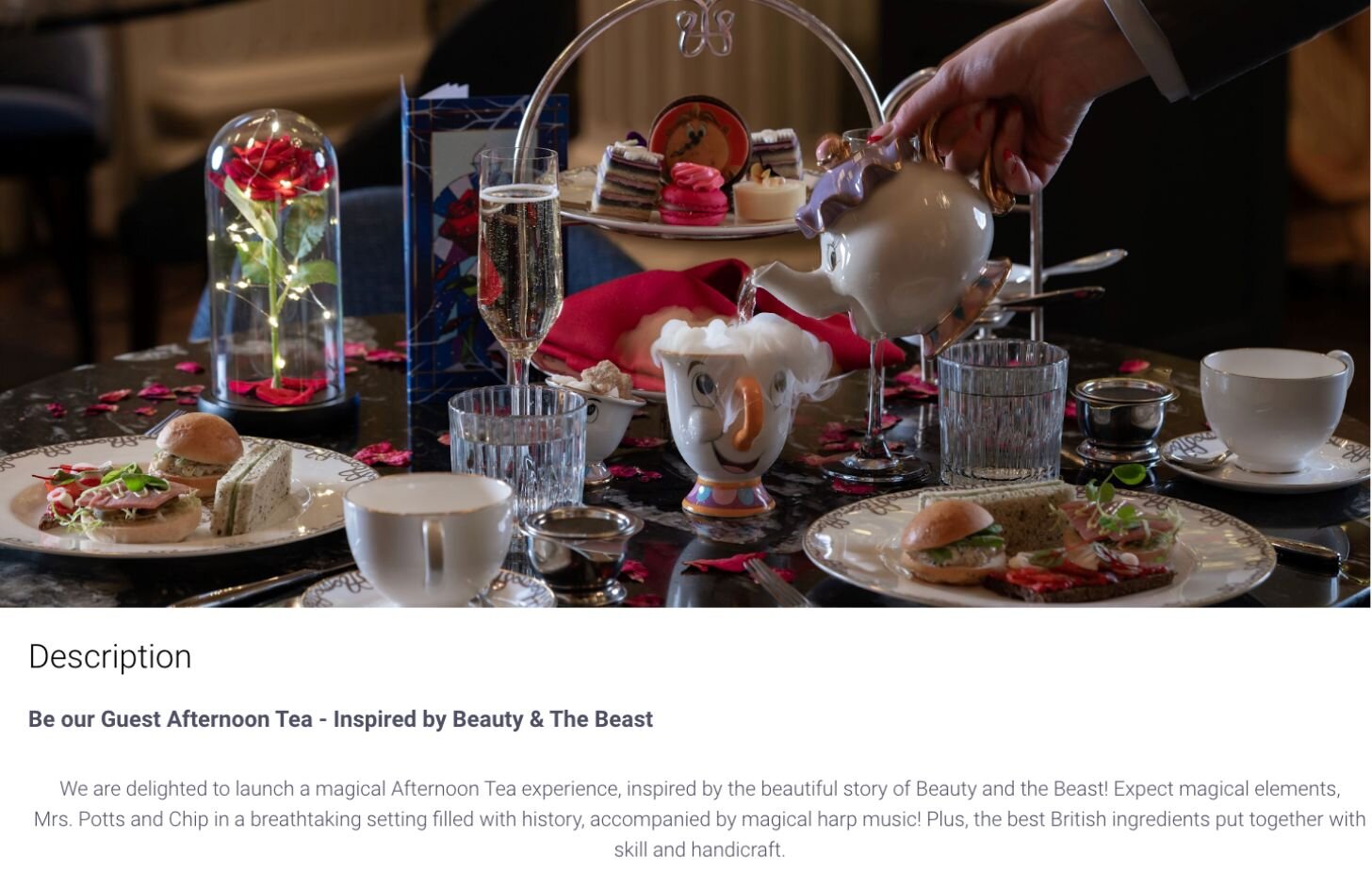For example, The Homage in the Waldorf Hotel enchants with its “Beauty and the Beast”-themed tea. Guests enjoy magical elements, cameos by Mrs. Potts and Chip and harp music.