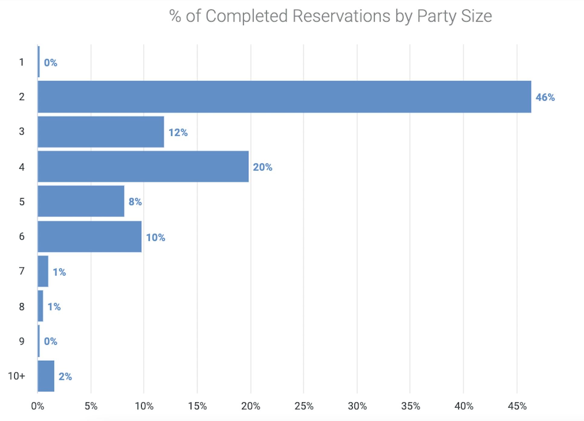 With these ideas in mind, savvy operators work to maximize their so-called “capacity utilization” – the measure of how many seats in the restaurant are full at any given time. While there are many factors that influence this number, it can be a helpful shortcut to first look at the party size distribution in your reservations report: